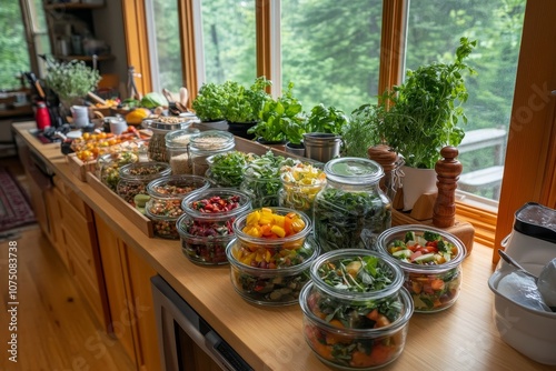 © woters, Fototapeta premium Colorful collection of fresh vegetables and herbs in glass jars on a wooden countertop in a bright kitchen during daytime