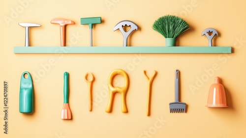 © TUN, Obraz premium Colorful Collection of Gardening Tools on Yellow Background