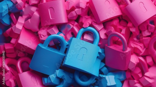 © pisan thailand, Naklejka premium Colorful collection of small locks in blue and pink, scattered among playful shapes, emphasizing security and creativity.