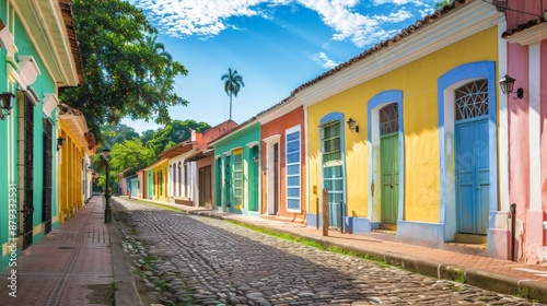 Naklejka premium Colorful colonial buildings in a historic district with cobbled streets