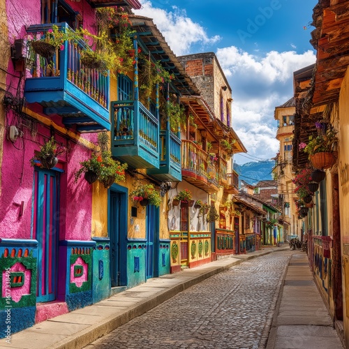 © Promptalo, Fototapeta premium Colorful colonial street with vibrant buildings, flower-filled balconies, and cobblestone path under a bright blue sky