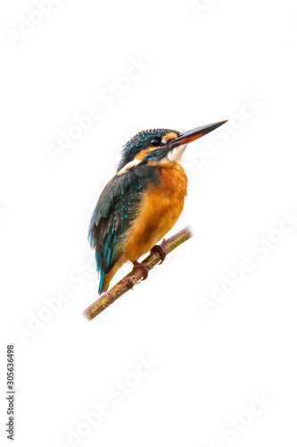 © phichak, Fototapeta premium Colorful Common Kingfisher perching on a tree branch looking into a distance isolated on white background
