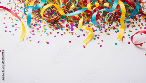 Fototapeta premium Colorful confetti and ribbons are cascading down a clean white background,...