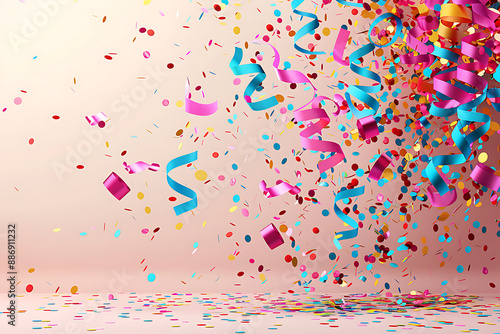 Fototapeta premium Colorful confetti and streamer on white background. Confetti background with...
