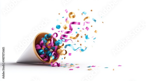 Fototapeta premium Colorful Confetti Exploding from Party Cone on White Background
