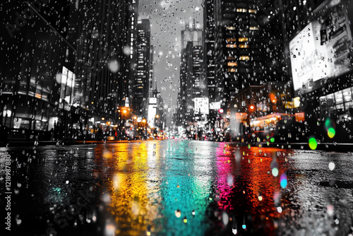 © Kateryna, Naklejka premium Colorful confetti falls through a foggy urban landscape in the heart of a city during a lively celebration