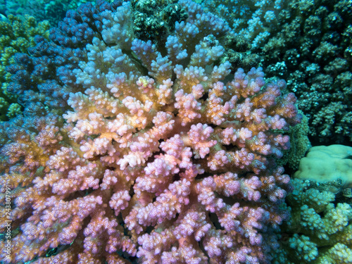 Obraz premium Colorful coral reef at the bottom of tropical sea, underwater landscape.