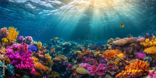 © jambulart, Naklejka premium Colorful coral reef in blue ocean with sunbeams.