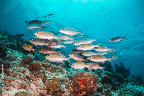 © Aaron, Fototapeta premium Colorful coral reef surrounded by tropical schools of small fish in clear blue water