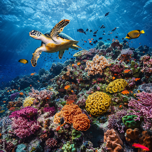© Bohdan, Fototapeta premium Colorful coral reef teeming with marine life and a turtle gliding above