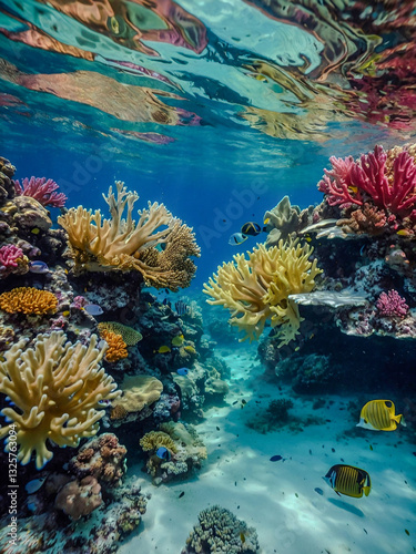 Naklejka premium Colorful coral reef teeming with marine life in clear blue waters.