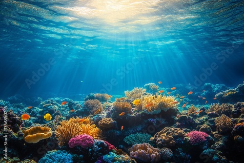 © ChaoticMind, Fototapeta premium Colorful coral reef teeming with marine life in clear blue waters during a sunny day