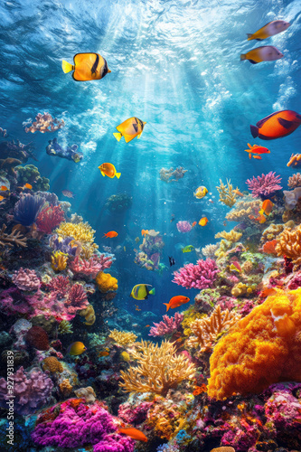 Fototapeta premium Colorful coral reef teeming with tropical fish in clear blue water