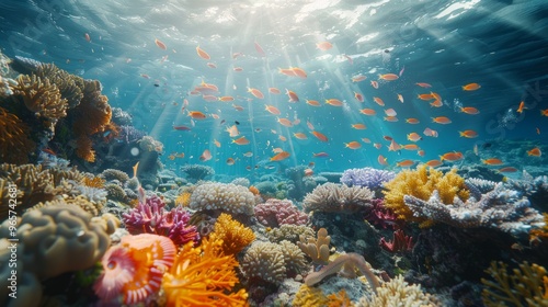 Fototapeta premium Colorful coral reef teeming with vibrant fish underwater during midday in a...