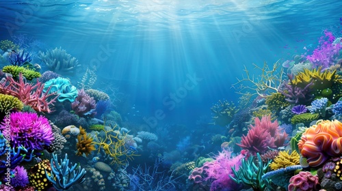 Fototapeta premium Colorful Coral Reef Underwater Scene with Bright Sunlight and Vibrant Marine...