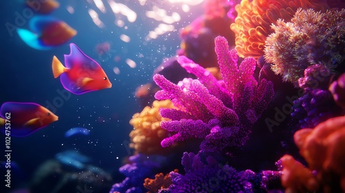 Naklejka premium Colorful coral reef with fish swimming in clear blue water.