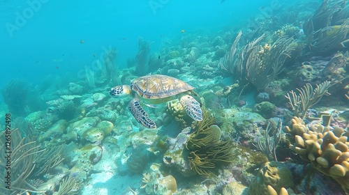 Naklejka premium Colorful Coral Reef with Sea Turtle Swimming Underwater