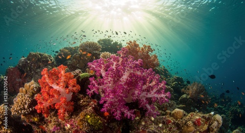 © indiyah, Obraz premium Colorful Coral Reef with Sunlight and Fish Swimming Underwater