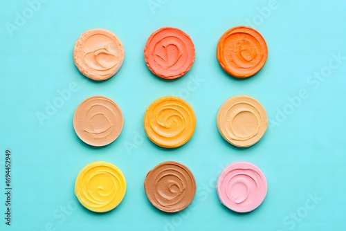 Obraz premium Colorful cosmetic foundation samples arranged neatly on a blue background for beauty product testing