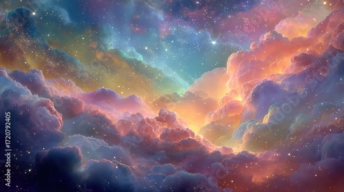 © Sulizi, Fototapeta premium Colorful Cosmic Clouds Against Starry Sky with Glowing Lights and Ethereal Glow in Deep Space Atmosphere
