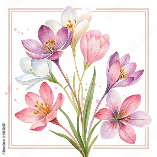 Fototapeta premium colorful crocus flowers watercolor illustration-watercolor illustration of blooming crocus flowers in vibrant shades of purple, pink, yellow, and white, symbolizing spring, beauty, and renewal.
