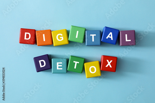© New Africa, Obraz premium Colorful cubes with phrase DIGITAL DETOX on light blue background, flat lay