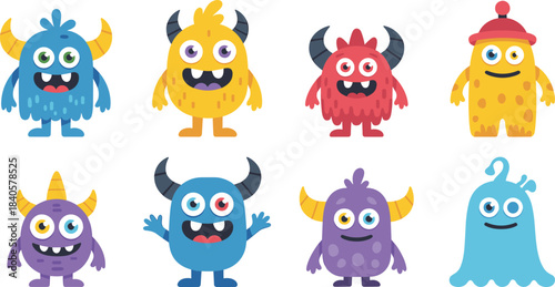 © Creative vectors, Fototapeta premium Colorful cute cartoon monster characters set with different expressions and shapes, fun illustration for kids, fantasy, playful design