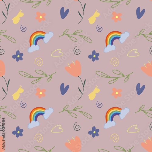 © Valeriya, Naklejka premium Colorful cute floral and rainbow seamless pattern background. Textured illustration, hand drawn.