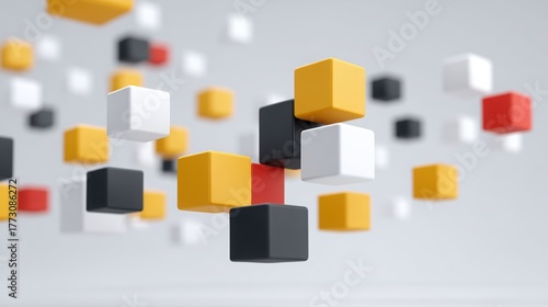© Preeyanuch, Obraz premium Colorful 3D cubes floating in a minimalist space create a dynamic visual effect.