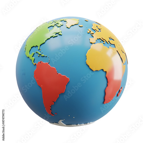 © pippadigs, Naklejka premium Colorful 3D model of planet Earth. Global perspective. 3d rendering isolated on white background. Cartoon plastic style