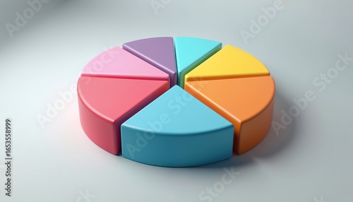 © Viktor, Obraz premium Colorful 3D pie chart with multiple segments on solid grey background. Generative AI illustration represents business growth, financial strategy, data analysis with vibrant colors, geometric,