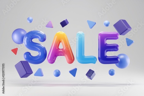 © Vibudhaart, Naklejka premium Colorful 3D SALE text with vibrant gradient and floating geometric shapes.