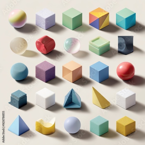 Obraz premium Colorful 3D shapes studio shot, geometric forms background, design elements