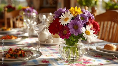 Naklejka premium Colorful daisy bouquet centerpiece decorates the table set for a bright and cheerful dinner party at home.