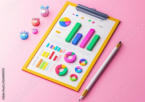 © artwiyanastudio, Naklejka premium Colorful data analysis on clipboard with cute animals, pink background