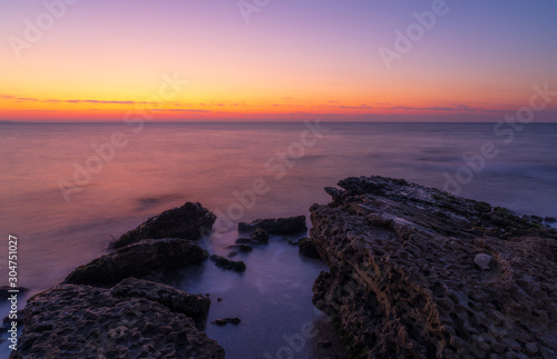 Fototapeta premium Colorful dawn on a rocky seashore, long exposure photography