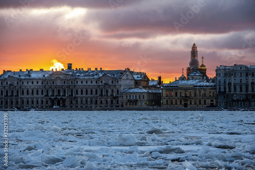© Valerii Ivanov, Fototapeta premium colorful dawn over the Palace embankment across the Neva river, covered with sharp ice floes