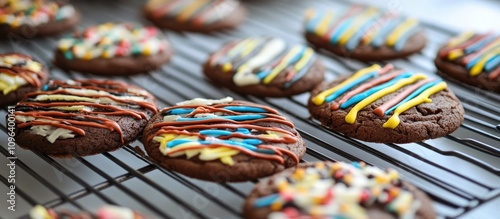 Fototapeta premium Colorful decorated cookies cooling on a wire rack showcasing delightful...