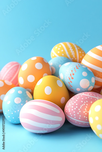Fototapeta premium Colorful decorated Easter eggs arranged on a blue background, creating a...