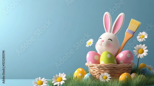 Obraz premium Colorful decorated Easter eggs in a woven basket on a blue background with flowers