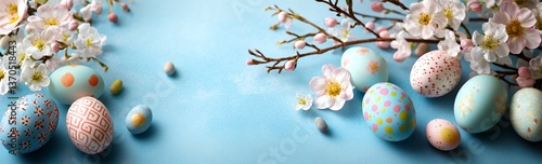 Fototapeta premium Colorful, decorated Easter eggs surrounded by delicate cherry blossoms.