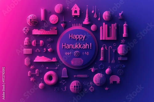 Fototapeta premium Colorful decorations showcasing various symbols of Hanukkah such as menorahs,...