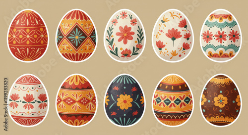 Fototapeta premium Colorful decorative easter eggs with floral and geometric patterns on beige...