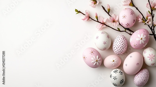 © Oksana, Fototapeta premium Colorful decorative eggs arranged with blooming branches create a festive spring atmosphere for holiday celebrations