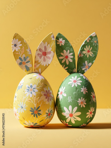 © Kunut, Fototapeta premium Colorful decorative eggs with floral patterns and bunny ears on bright yellow background create cheerful and festive atmosphere