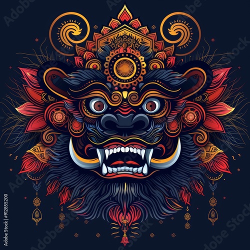 © dony, Fototapeta premium Colorful detailed ornate Balinese demon mask geometric frame.