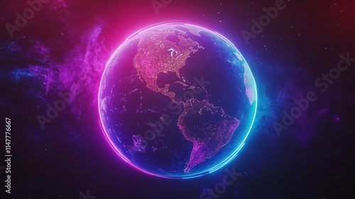 © Sajib, Obraz premium Colorful digital artwork of Earth with glowing neon effects in space.