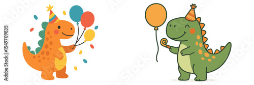 © Zaleman, Naklejka premium Colorful dinosaurs celebrating with balloons at a cheerful party setting during daytime