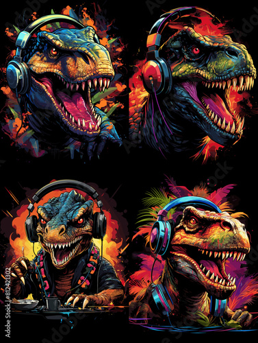 Obraz premium Colorful dinosaurs wearing headphones and DJ gear, roaring with energy in a...
