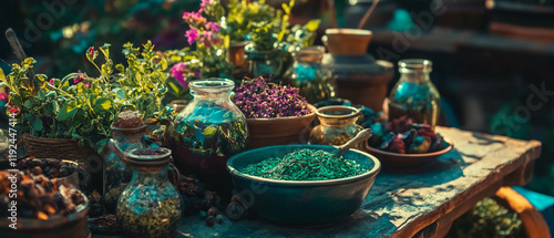 Fototapeta premium Colorful display of aromatic herbs and spices in a vibrant market setting